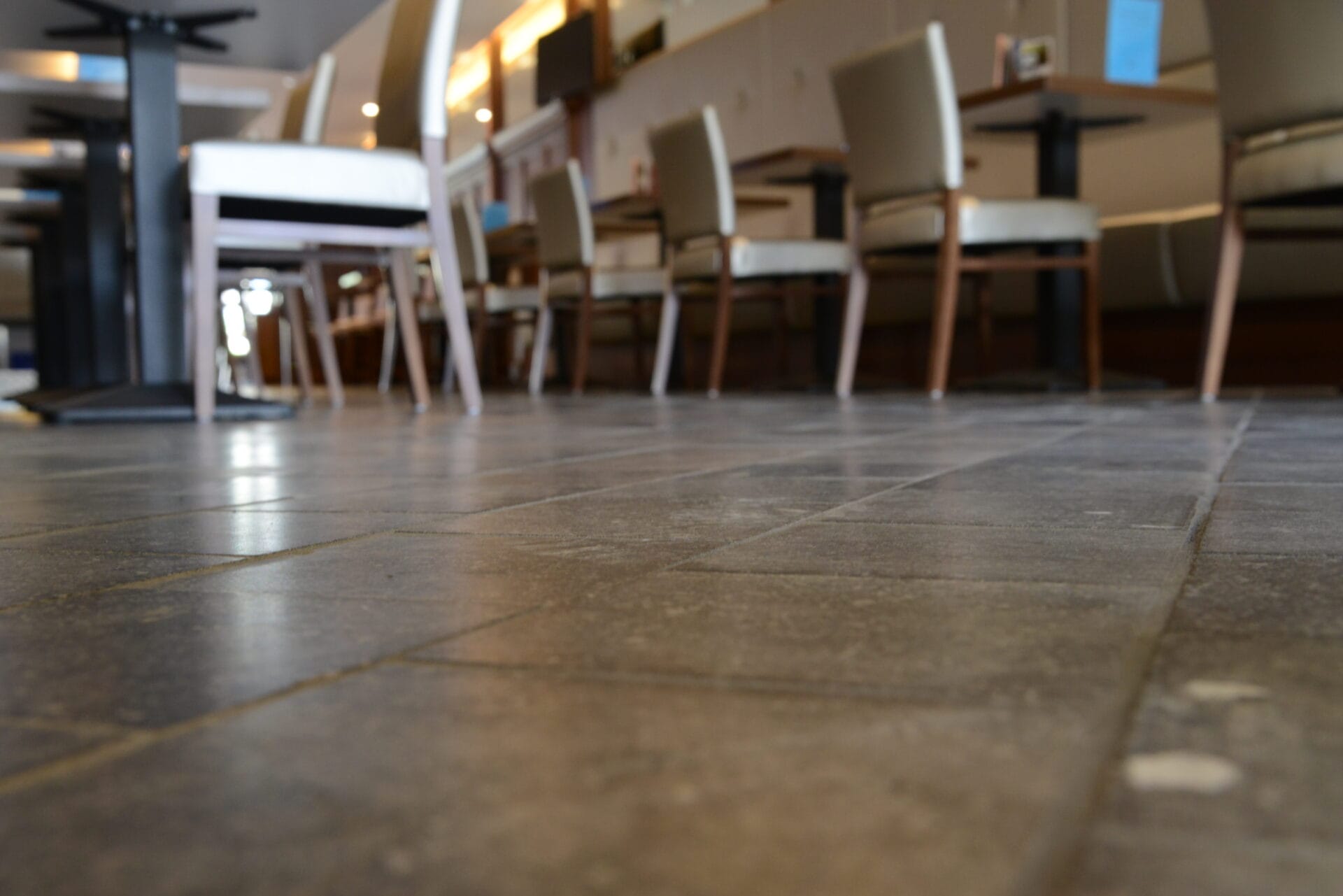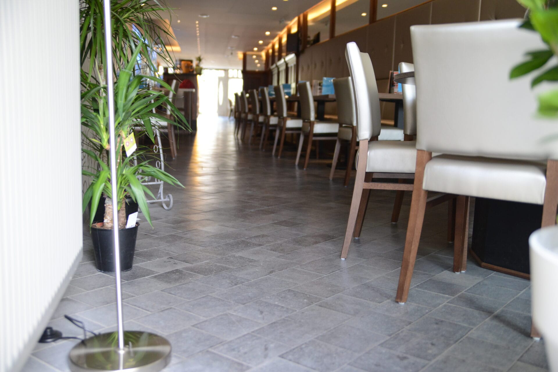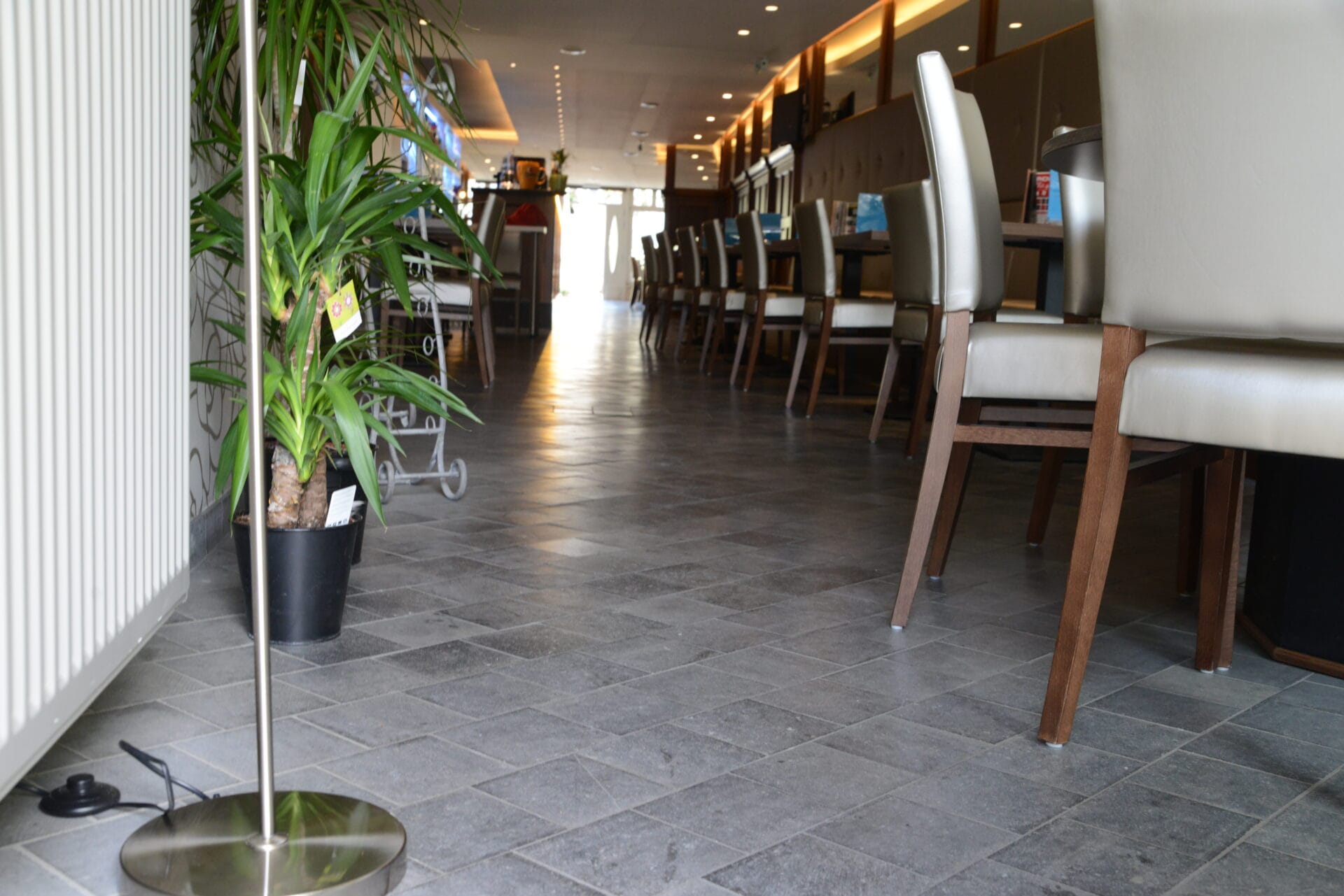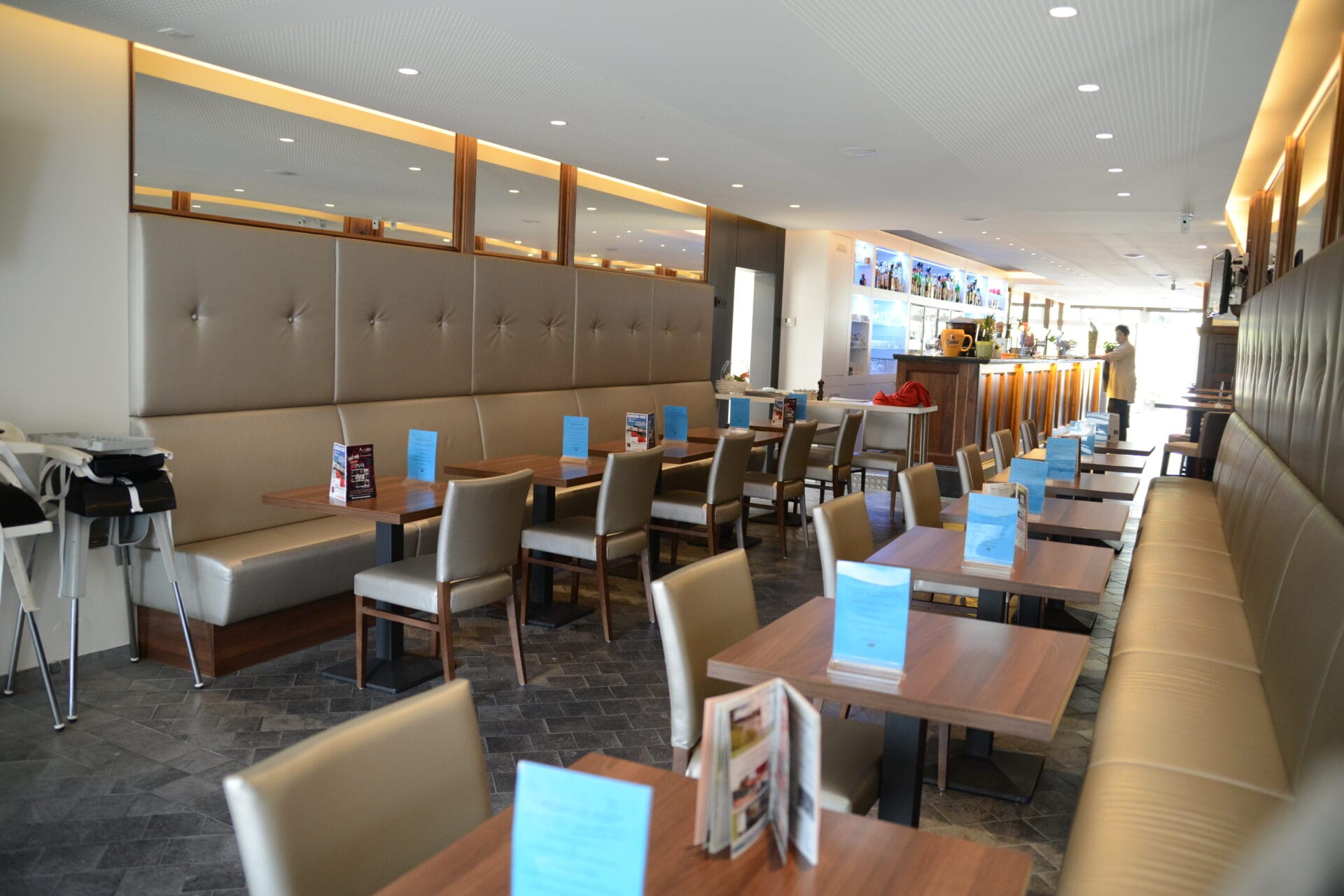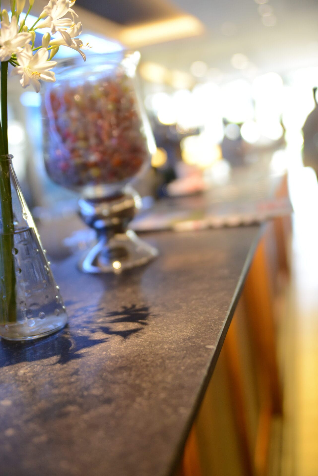 Le sol est réalisé en dalles de pierre naturelle vieillies, offrant un aspect authentique et plein de caractère. Le comptoir présente une finition adoucie foncée, apportant une touche d’élégance et de raffinement à l’ensemble.